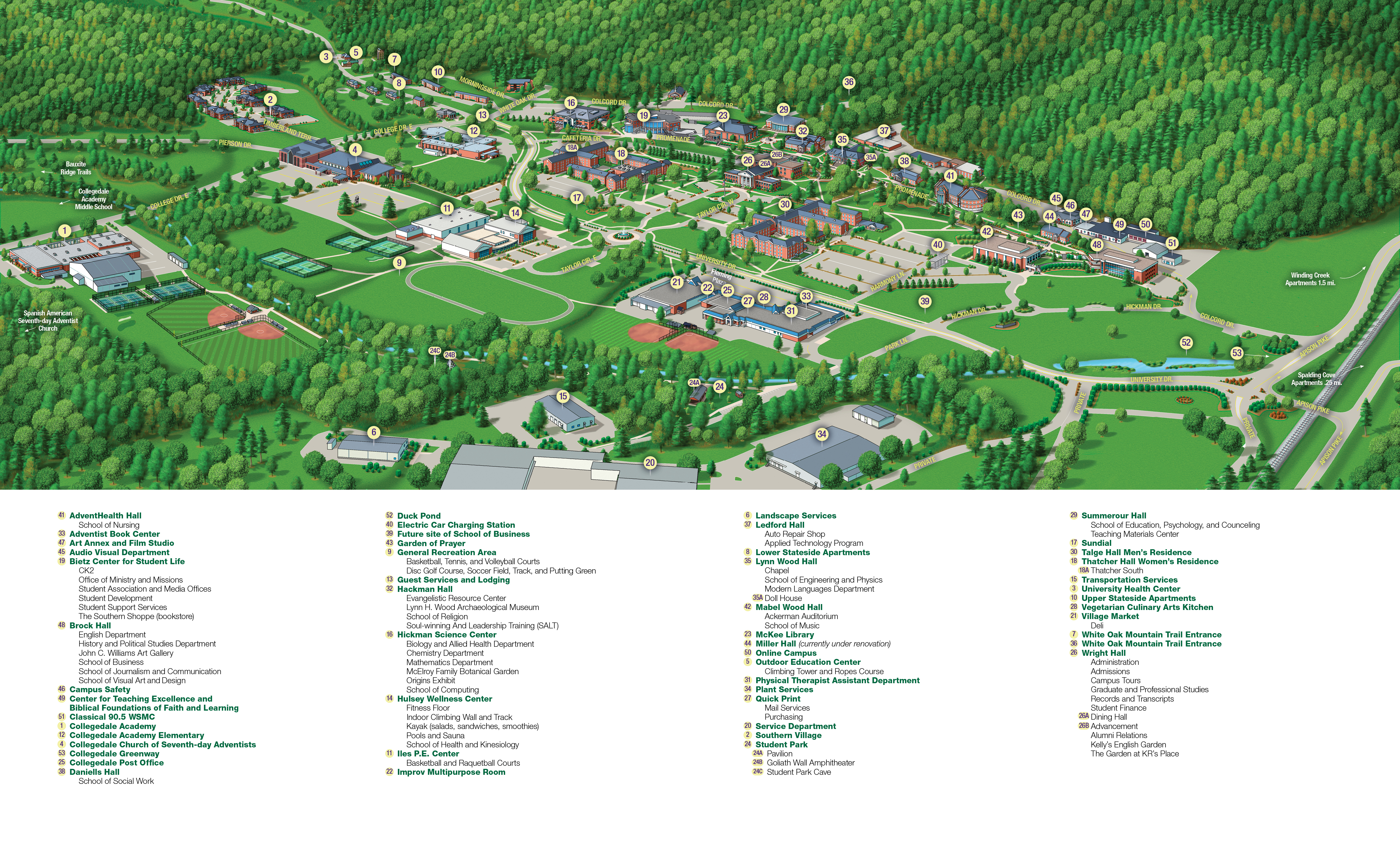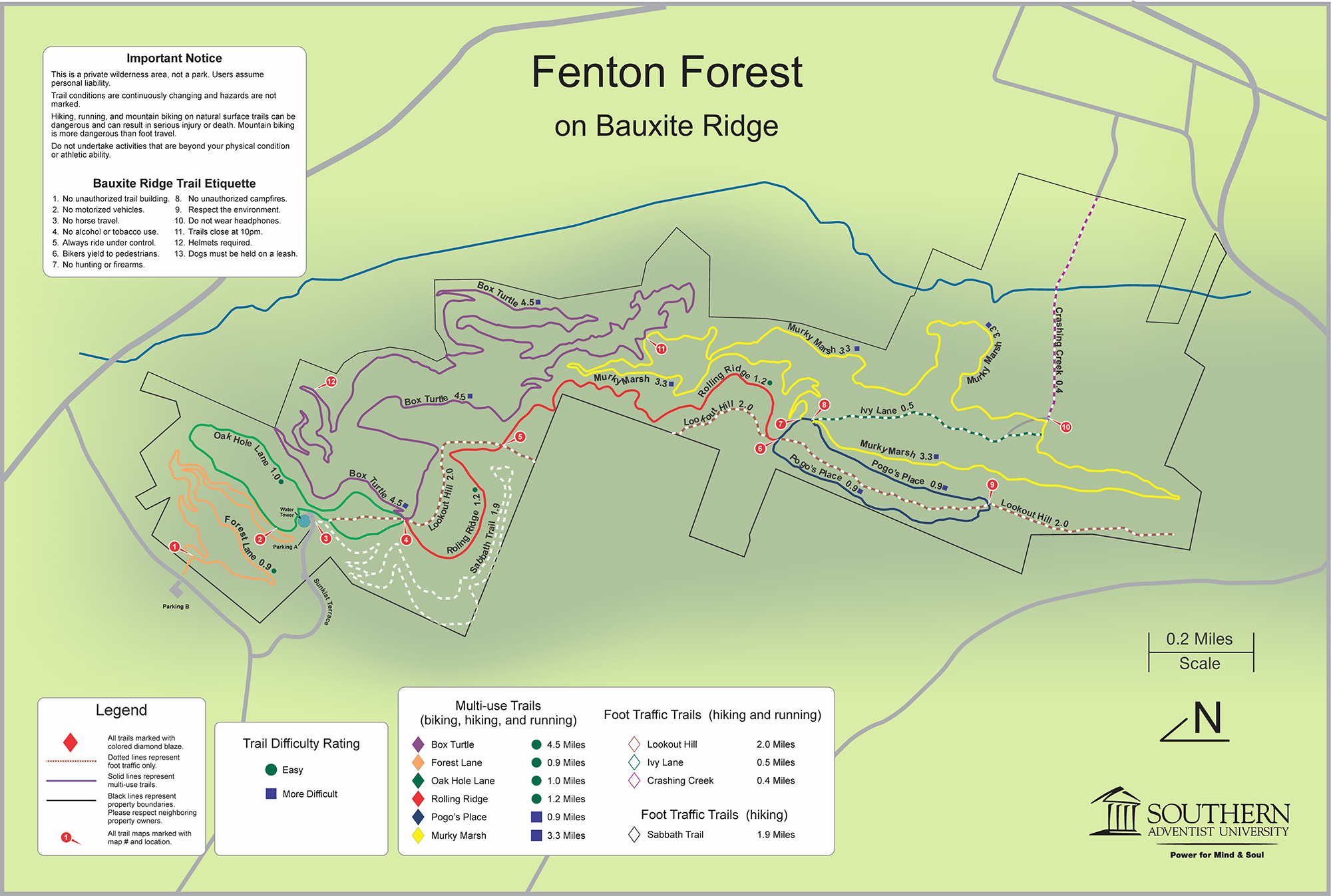 In 2015, Southern gave the name “Fenton Forest” to its wooded areas on Bauxite Ridge. This immortalizes a series of parables—based in a fictional Fenton Forest—written by former Southern president Gordon Bietz, which he frequently used as sermon illustrations. The trail names in this area are also inspired by the stories.